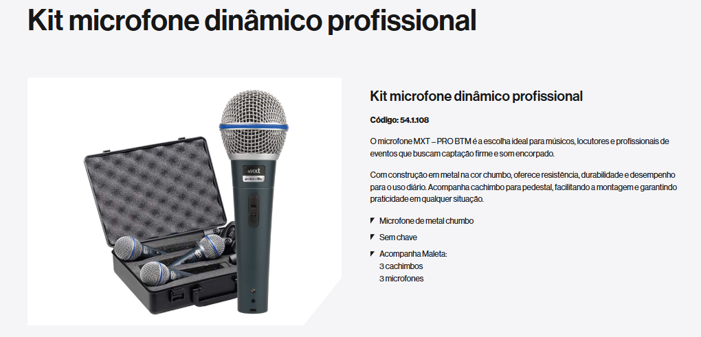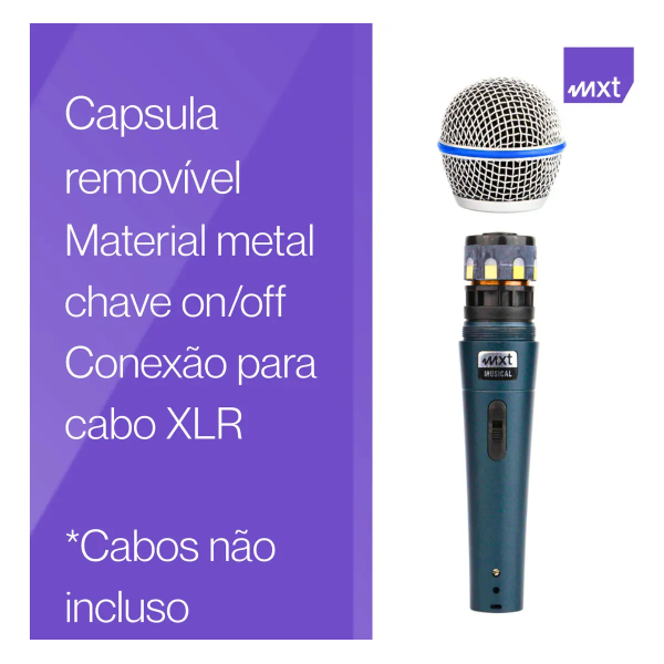 Especificações: Marca: MXT Modelo: PRO BTM-58a Tipo: Microfone dinâmico profissional com fio Material: Corpo em metal na cor chumbo, resistente e durável Chave liga/desliga: Sim, integrada ao corpo para controle prático Design: Robusto, com pegada firme e acabamento profissional Conexão: XLR, compatível com caixas de som, mesas e amplificadores Uso recomendado: Palcos, eventos, igrejas, estúdios, karaokê e locuções Indicado para: Vozes ao vivo e gravações em ambientes variados Quantidade: Kit com 3 microfones iguais + Maleta + 3 Cachimbos Com objetivo de equipar profissionais e entusiastas com um conjunto completo de três microfones dinâmicos robustos e confiáveis, prontos para uso simultâneo em palcos, eventos, igrejas e estúdios. Este kit oferece a durabilidade do corpo em metal chumbo e a praticidade da chave liga/desliga em três unidades do modelo PRO BTM-58A, garantindo qualidade profissional consistente para múltiplas vozes ou instrumentos com ótimo custo-benefício.