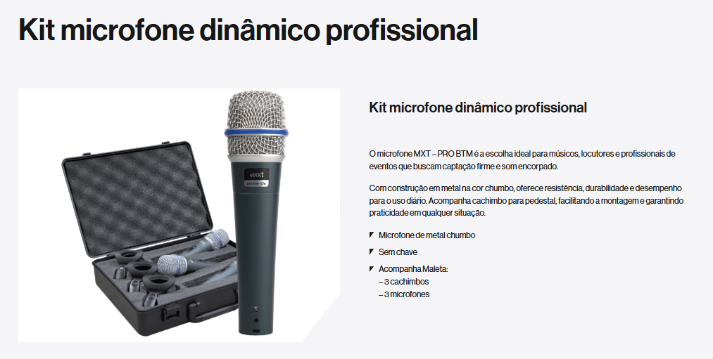 Com objetivo de equipar profissionais e entusiastas com um conjunto completo de três microfones dinâmicos robustos e confiáveis, prontos para uso simultâneo em palcos, eventos, igrejas e estúdios.