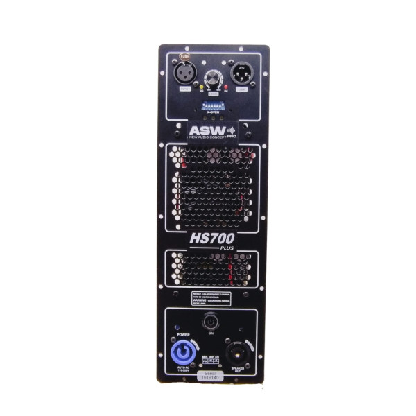 Contém 1 Entrada e uma Saída de sinal (pré) e 1 Saída (speakon) para alto-falantes.